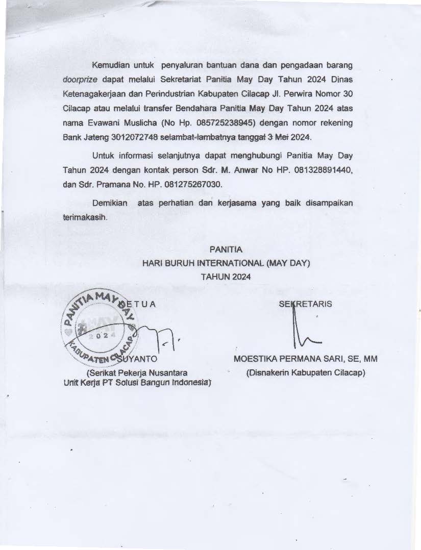 | Keterangan | : | Donasi peringatan acara MAY DAY 2024 |