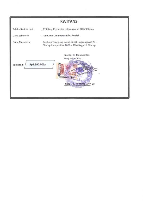| Keterangan | : | Bantuan Dana TJSL PT KPI RU IV pada kegiatan Cilacap Campus Fair 2024 yang diselenggarakan oleh SMA Negeri 1 Cilacap |