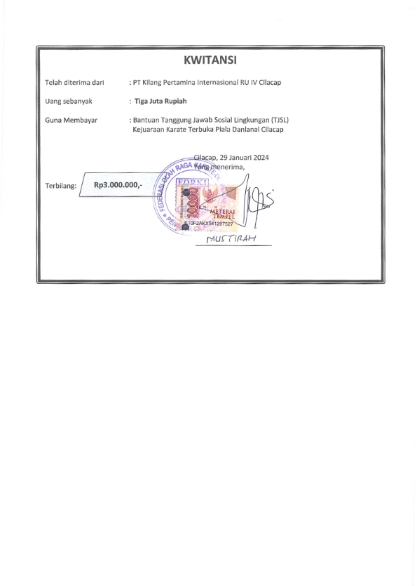 | Keterangan | : | Bantuan Dana TJSL PT KPI RU IV pada kegiatan Kejuaraan Karate Terbuka Piala Danlanal Cilacap 2024 |