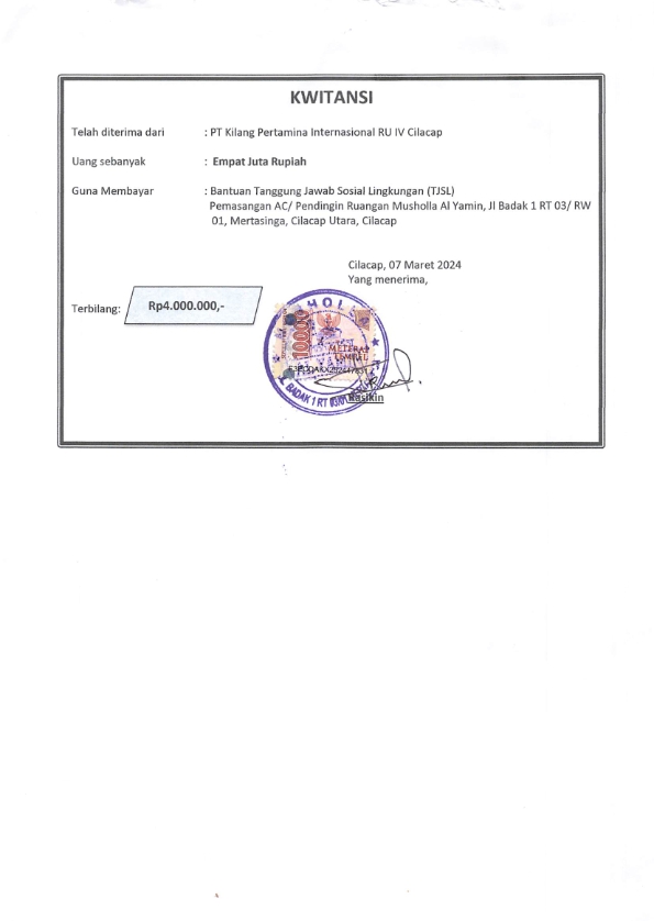 | Keterangan | : | Bantuan dana TJSL PT KPI RU IV untuk pengadaan AC/pendingin ruangan sebagai fasilitas penunjang kegiatan ibadah di Mushola Al-Yamin, Mertasinga |