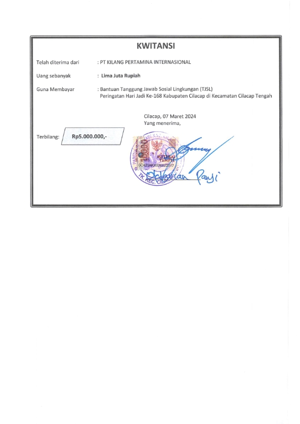 Bantuan dana TJSL PT KPI RU IV dalam kegiatan peringatan hari jadi ke-168 Kabupaten Cilacap yang diselenggarakan di Kecamatan Cilacap Tengah