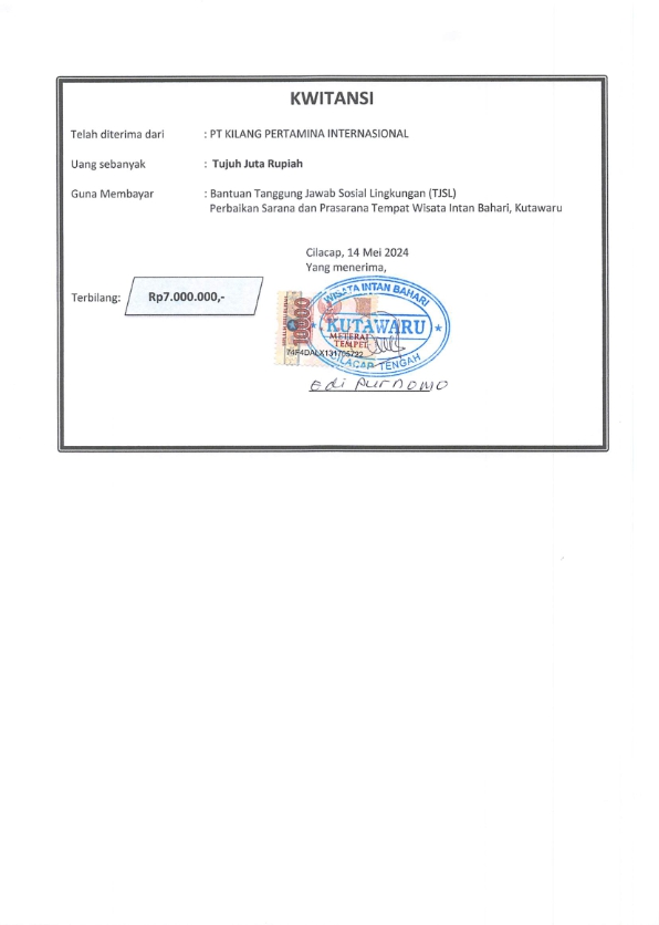 | Keterangan | : | Bantuan dana TJSL PT KPI RU IV untuk pengadaan alat-alat material perbaikan sarana prasarana di UMKM Intan Bahari, Kutawaru |