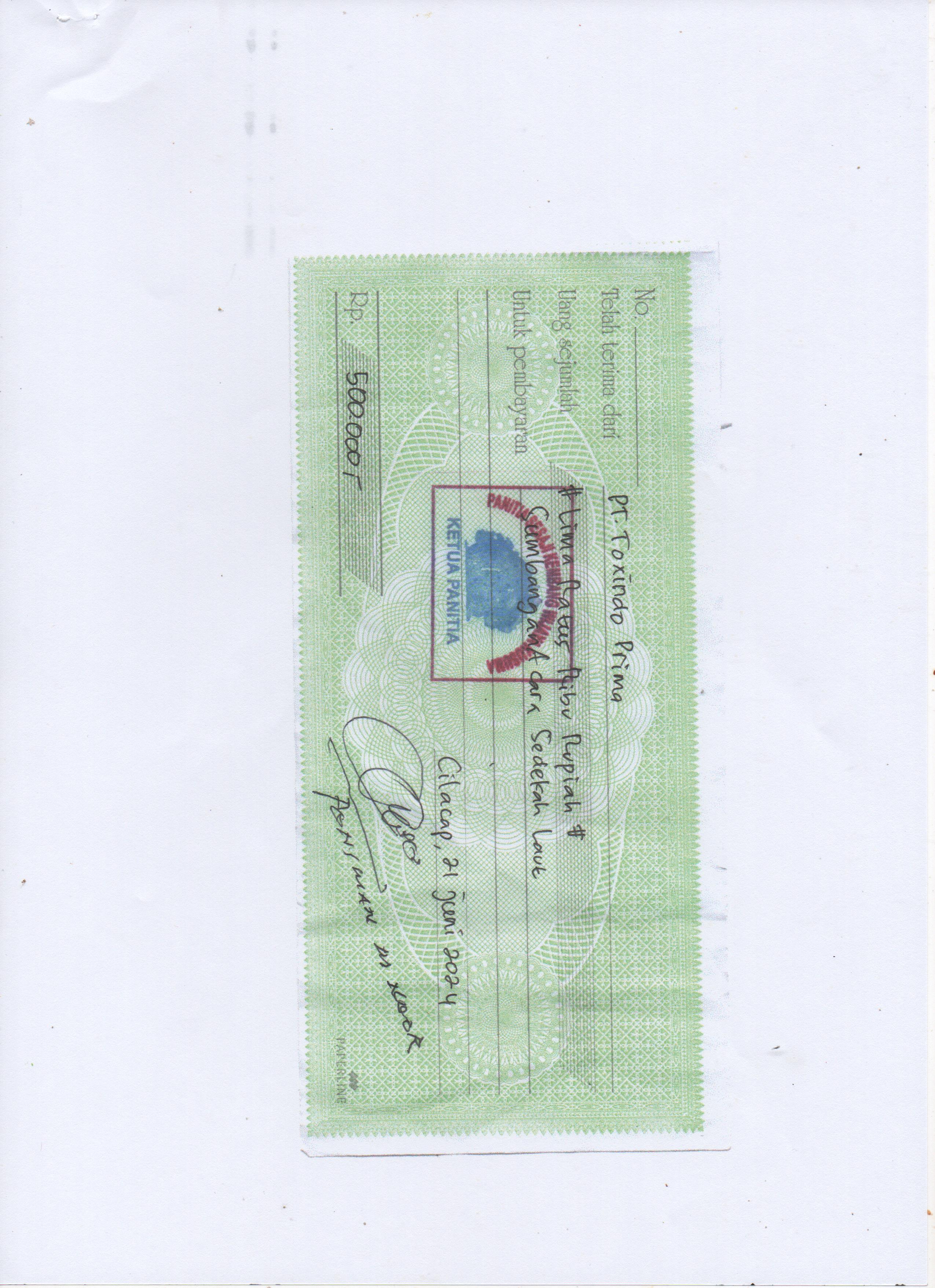 Donasi sebesar Rp 500.000,- kepada Panitia Sesaji Cangkok - Kembang Wijaya Kusuma (Kelompok Nelayan Sentolokawat) dalam acara Sedekah Laut 2024 yang akan diselenggarakan pada tanggal 12 Juli 2024