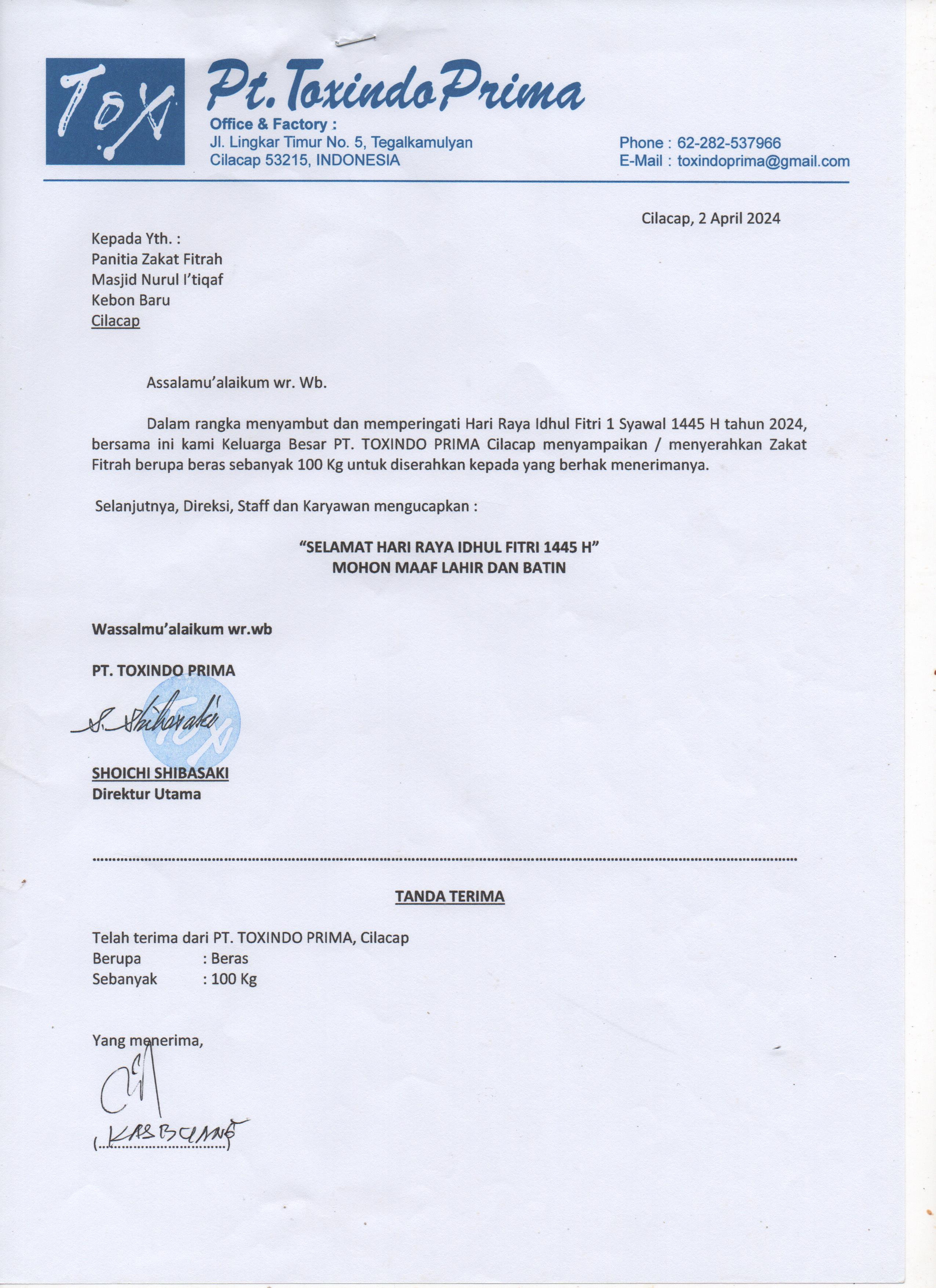 Zakat fitrah berupa 100 kg beras dalam rangka Idul Fitri 2024 kepada Panitia Zakat Fitrah Masjid Nurul Ittihad, Cilacap Selatan