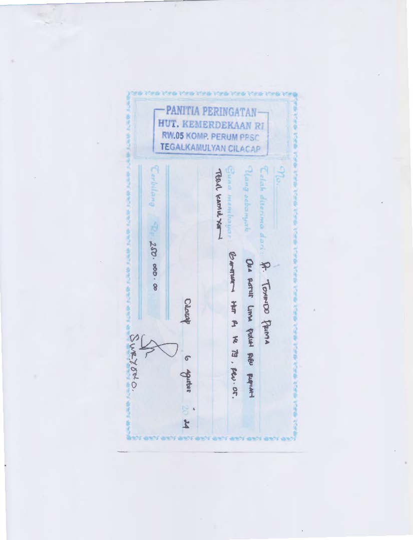 | Keterangan | : | Bantuan untuk kegiatan Peringatan HUT RI ke-79 Warga RW.05 Kompleks PPSC Tegalkamulyan Cilacap Selatan 2024 |