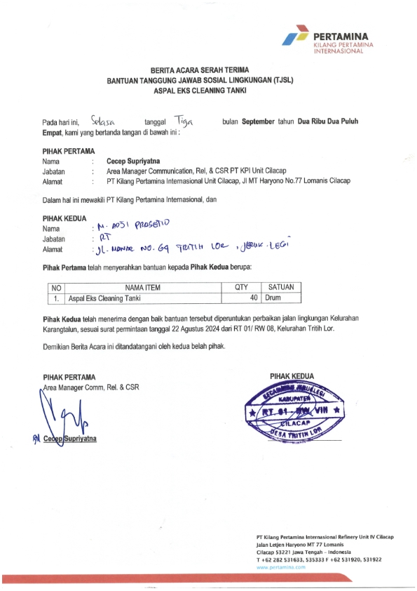 | Keterangan | : | Bantuan Aspal Eks-cleaning Tanki untuk perbaikan jalan di lingkungan RT 01/ RW 08, Tritih Lor |
