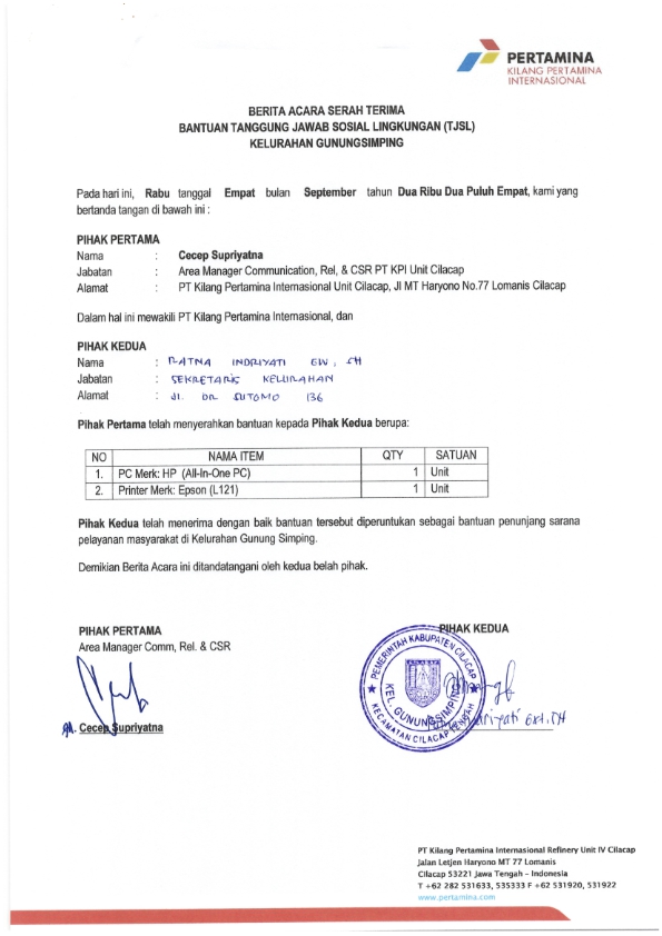 | Keterangan | : | Bantuan Sarana Kantor berupa seperangkat komputer untuk meningkatkan kualitas sarana pelayanan masyarakat di Kantor Kelurahan Gunung Simping |