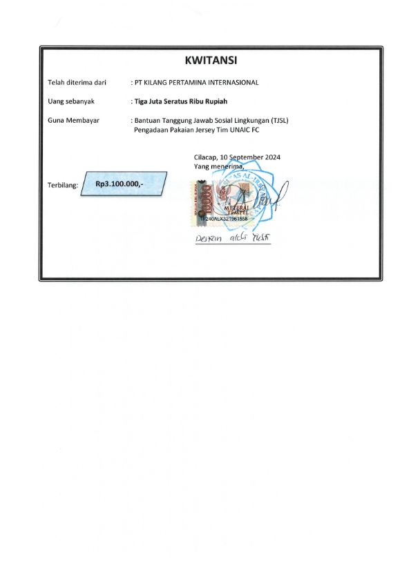 | Keterangan | : | Bantuan Dana Sponsorship untuk pengadaan jersey seragam UNAIC FC |