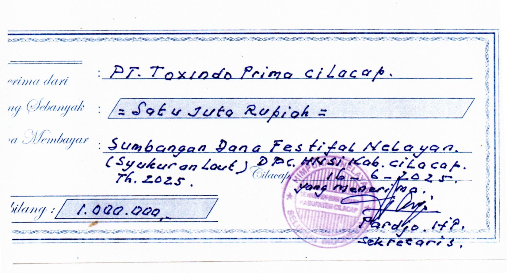 Bantuan berupa donasi uang tunai bagi Panitia Sedekah Laut 2025 DPC HNSI Cilacap, Tegalkamulyan, Cilacap Selatan