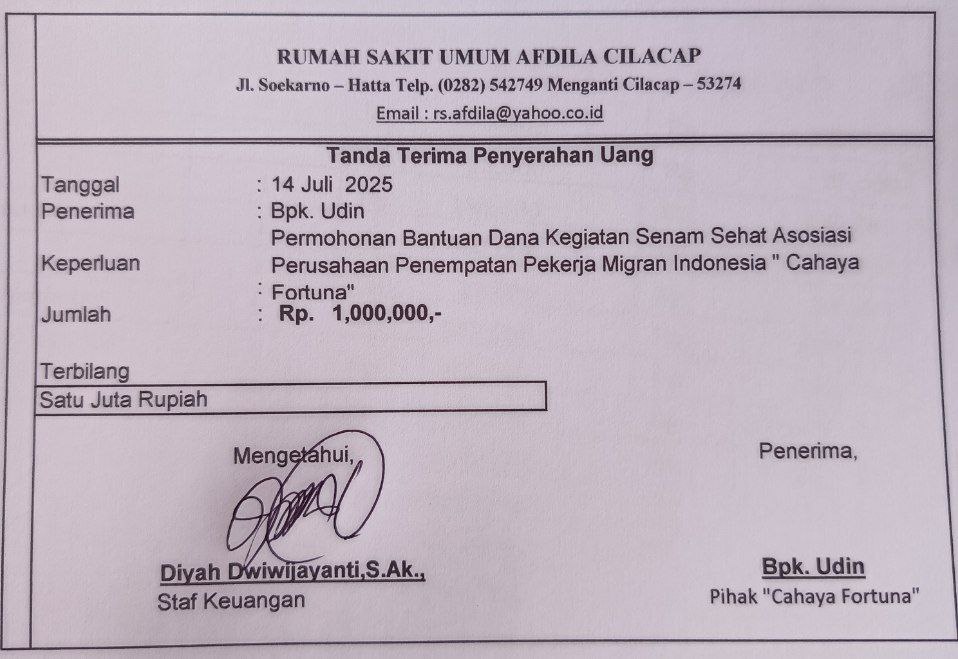 Pemberian bantuan dana untuk kegiatan assosiasi PT P3MI Cahaya Fortuna Cilacap dalam kegiatan senam sehat dan sosialisasi penempatan Pekerja Migran Indonesia secara Prosedural melalui P3MI resmi yang terdaftar di Disnaker Kab. Cilacap