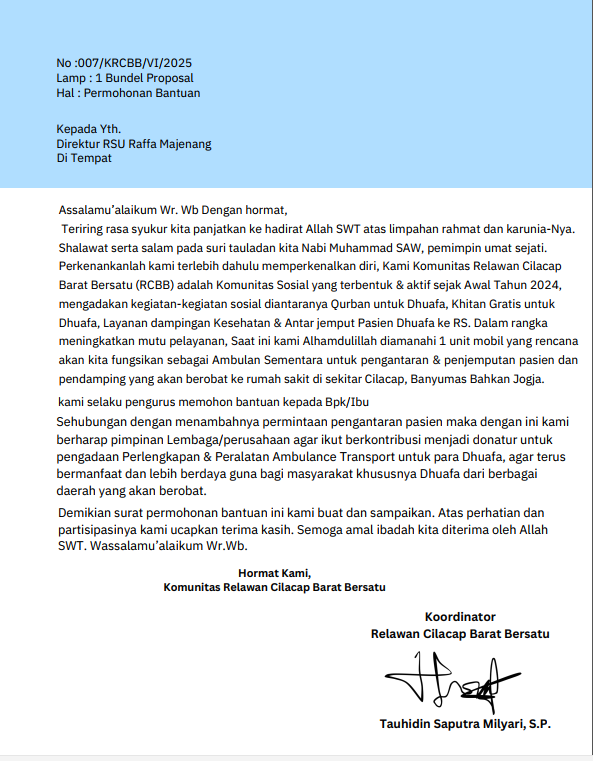 | Keterangan | : | Sponsorship Bantuan Dana Perlengkapan Ambulan Relawan Cilacap Barat Bersatu |