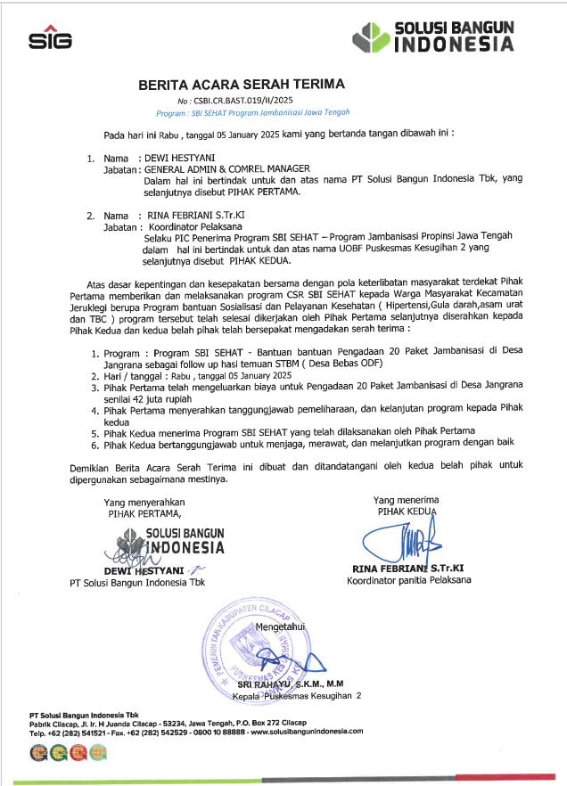 | Keterangan | : | Dukungan Genting dan sosialisasi kesehatan untuk ibu Hamil, Balita, remaja dan lansia serta dukungan material jambanisasi untuk masyarakat di sekitar pabrik dan tambang melalui puskesmas dan posyandu. |