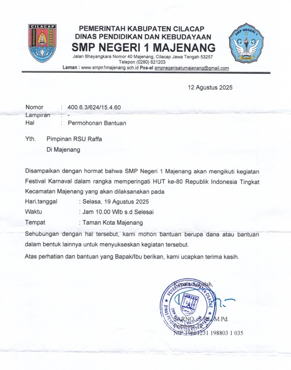 | Keterangan | : | Bantuan Dana Kegiatan Festival Karnaval SMP N 1 Majenang dalam Rangka Memperingati HUT RI ke 80 tingkat Kecamatan Majenang |