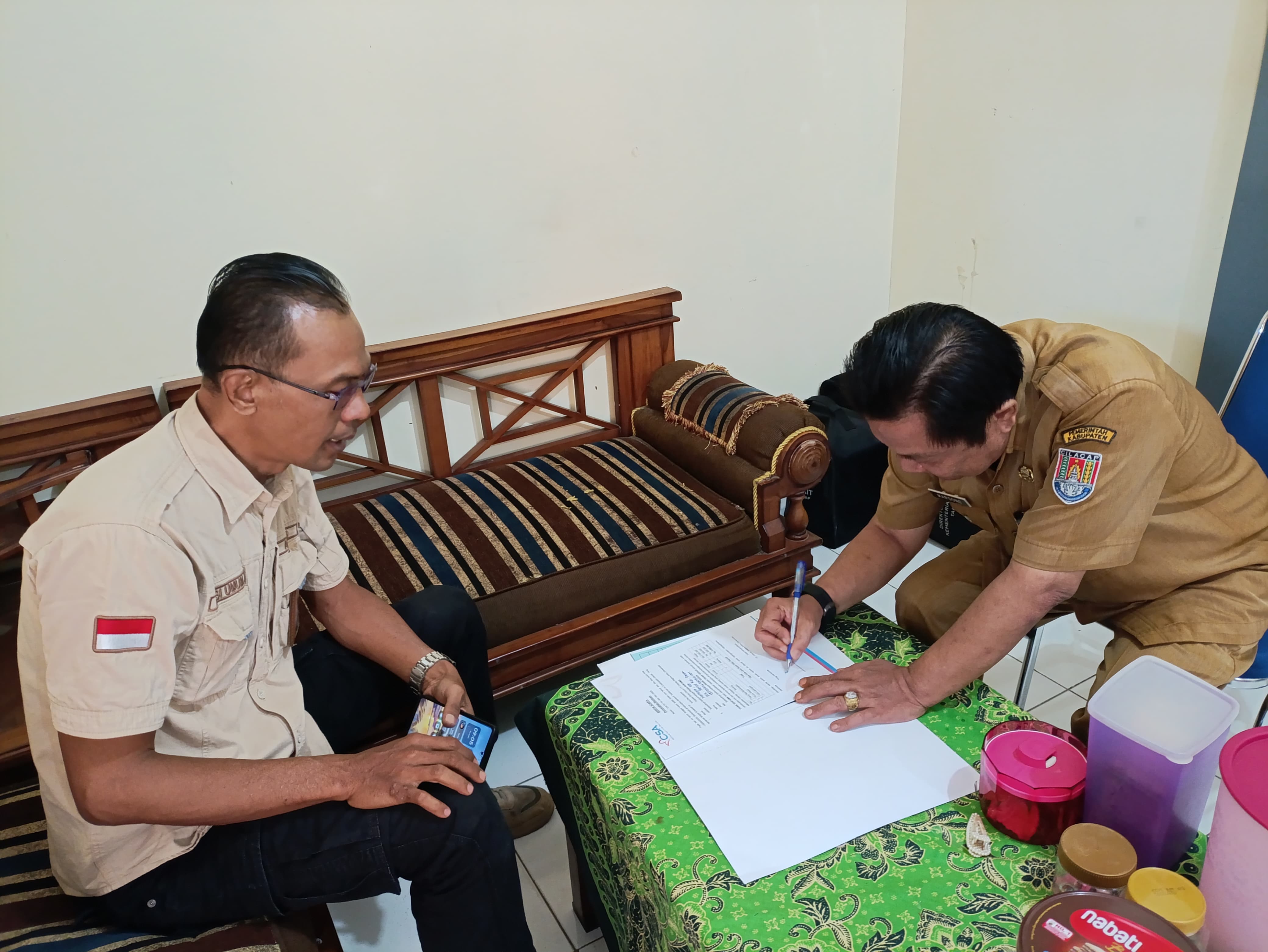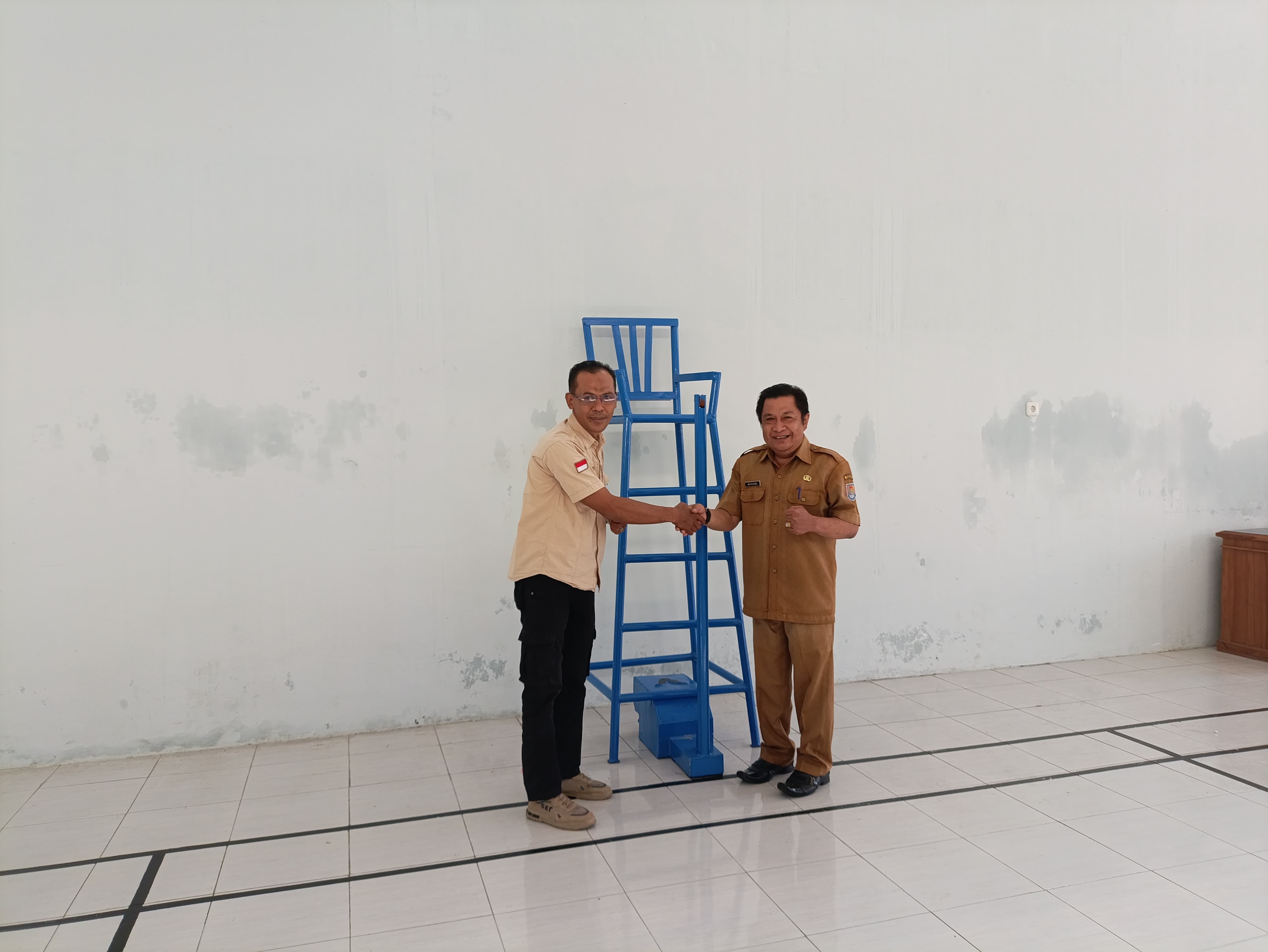 Foto penerimaan Bantuan untuk Pembuatan Line dan Sarana Lapangan Bulutangkis di Gedung Serbaguna Kelurahan Donan Kabupaten Cilacap