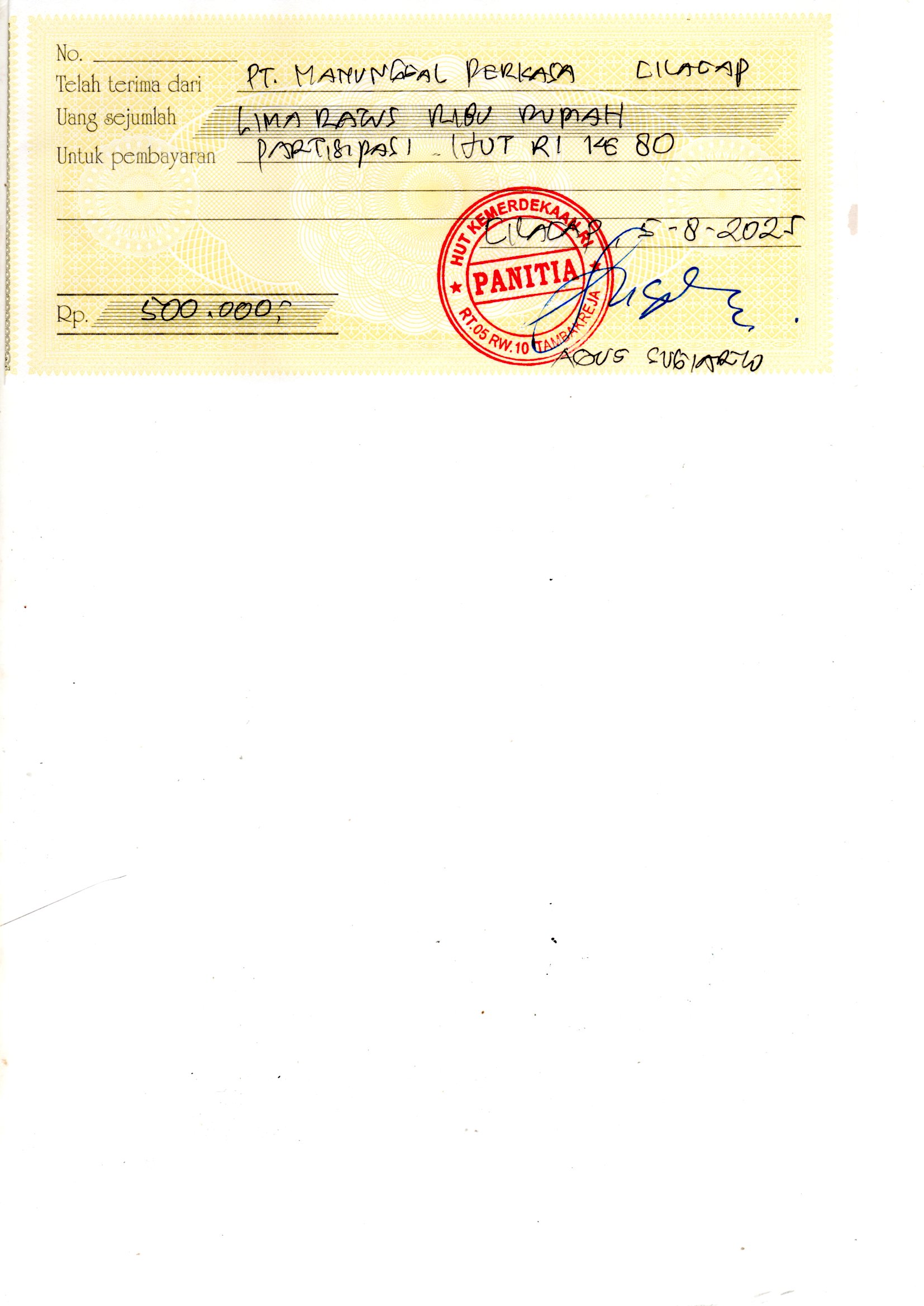| Alamat | : | 'Panitia Peringatan HUT RI Ke-80 RT.005 RW.010 Kelurahan Tambakreja, Jl. Kluwih Cilacap, Desa/Kelurahan Tambakreja, Kecamatan Cilacap selatan |