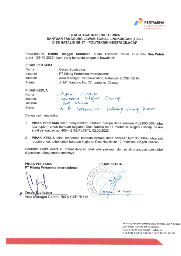 Bantuan Dana Kegiatan Dies Natalis ke-17 Politeknik Negeri Cilacap