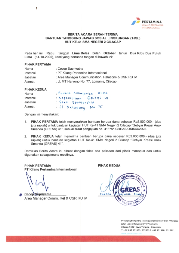 Bantuan Dana Kegiatan HUT ke-41 SMA Negeri 2 Cilacap (GREAS)