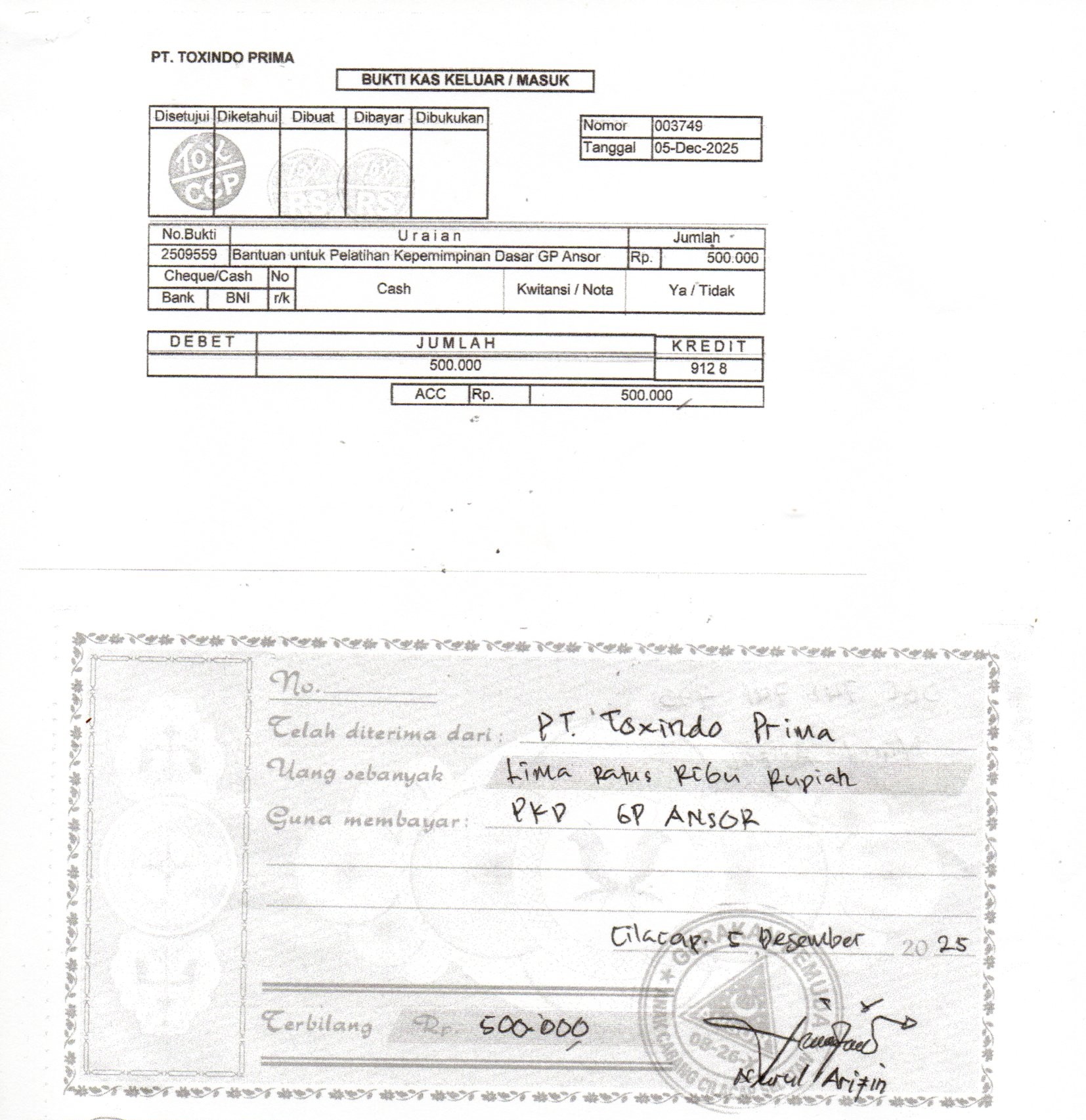 Donasi berupa uang tunai acara Pelatihan Kepemimpinan Dasar (PKD) Pimpinan Anak Cabang GP Ansor Kec. Cilacap Selatan
