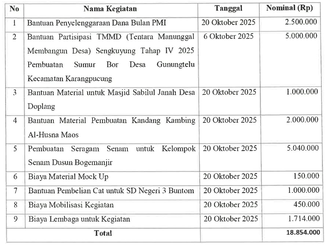 | Keterangan | : | Partisipasi Kegiatan Bersama Instansi dan Masyarakat bantuan pembuatan sumur bor untuk kegiatan kebencanaan, bantuan untuk mushola desa pedasong |