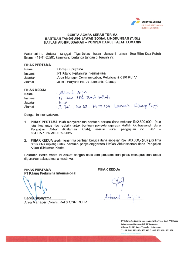 | Keterangan | : | Bantuan Dana Kegiatan Haflah Akhirussanah Khataman Kitab Pondok Pesantren, TPQ, Madin Darul Falah, Lomanis |